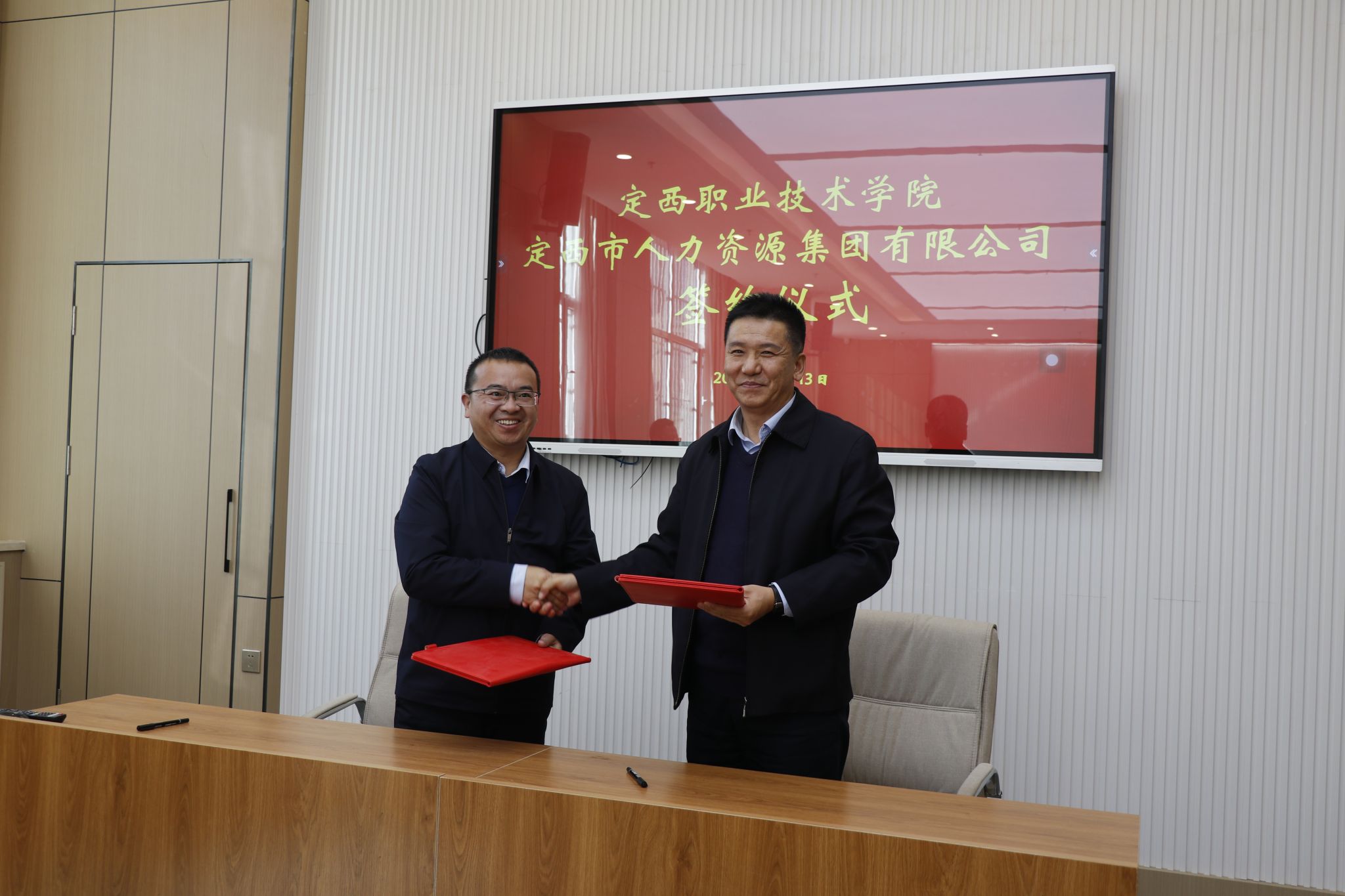 在全体与会人员的见证下,张学通与高兴伟分别代表双方正式签署了校企战略合作协议。此次签约既是定西职业技术学院深化产教融合、提升社会服务能力的重要举措,也是定西市人力资源集团公司拓展校企合作、优化服务模式的关键一步。
