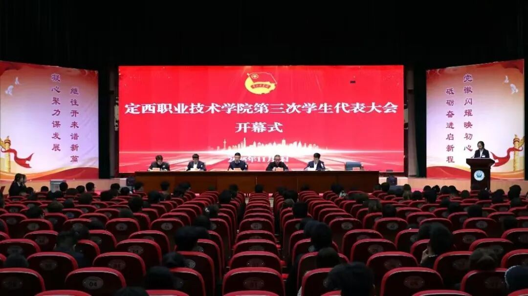 大会在庄严的国歌声中拉开帷幕。开幕式上赵棣宣读学校党委、上级学联《关于同意召开定西职业技术学院第三次学生代表大会的批复》。文育胜代表学校党委向大会的顺利召开表示祝贺。他指出,过去一年,全校各团学组织以习近平新时代中国特色社会主义思想为指引,在思想政治引领、校园文化建设、学生权益维护等方面取得积极成效,为助力学校高质量发展和服务地方建设作出重要贡献,并对学生会工作提出殷切期望。他强调,学生会组织要强化思想引领,引导广大同学在求真理、悟道理、明事理中筑牢信仰之基;一要坚持党的领导,始终坚持把青年学生最广泛最紧密地团结在党的周围;二要践行服务宗旨,充分发挥桥梁纽带作用,把为同学服务落到实处;三要聚焦主责主业,提升服务效能,更好发挥党联系青年学生的桥梁纽带作用;四要激励广大青年学子以奋发有为的姿态,争当挺膺担当的时代新人。