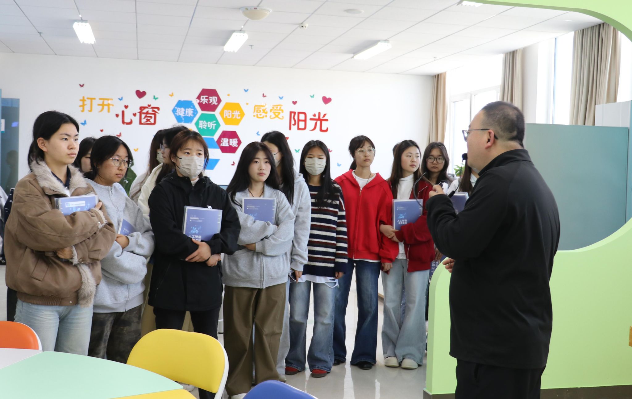 在心理健康服务中心,同学们依次参观了心理咨询室、沙盘游戏区等功能区,并亲身体验了心理测评机等专业设备。负责老师详细介绍了日常咨询流程,鼓励同学们遇到问题主动求助;结合“重走长征路”主题,心理老师还以长征途中红军战士在极端困境中仍坚守坚定信念的事迹为例,引导同学们深刻认识到:强大的心理韧性是走好新时代长征路的重要基石。